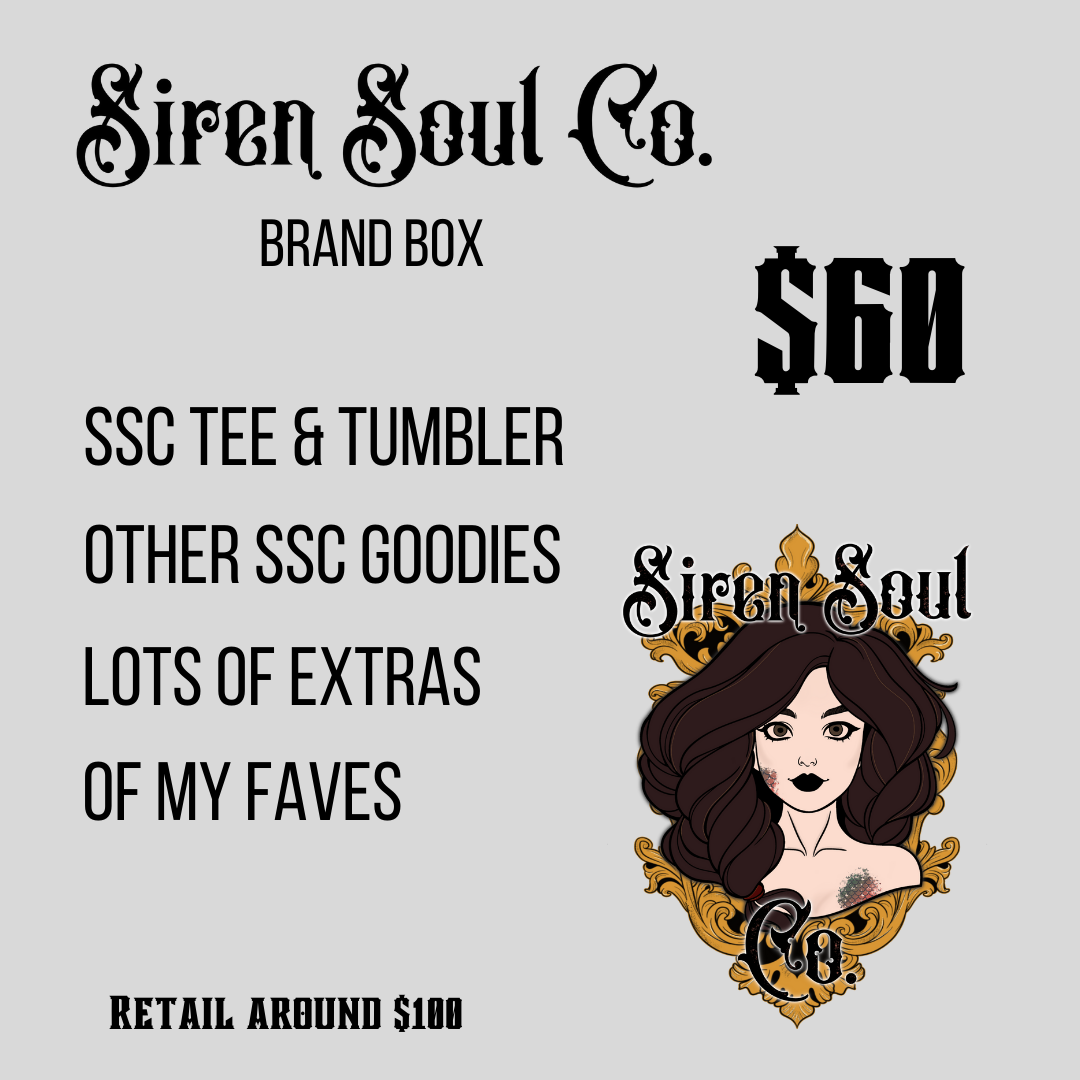 Siren Soul Co box filled with SSC items and some of my favorite things!🖤 Thank you for being apart of the SSC family!  Due to the custom sizing, all sales are final, no returns. If you have questions about sizing or shirt colors, please ask before ordering! Mystery Box items will not be refunded. Â